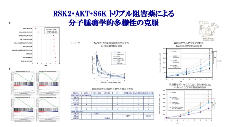 PDPK1はマスターレギュレーターとして多くのAGCキナーゼの活性を制御しています。われわれは、その被制御分子のうち、RSK2のN末端キナーゼ活性とAKTを制御することで、アポトーシス誘導分子であるBIMの誘導、BIDの活性化を伴うプログラム細胞死誘導を介した強力な抗腫瘍効果を骨髄腫細胞にもたらしうること、また、網羅的遺伝子発現解析、ならびにGene Set Enrichment解析などによる詳細な解析の結果、RSK2/AKT二重阻害は、それぞれの分子を単独で阻害した時と比し、有意に強力にMYC被制御遺伝子、mTOR被制御遺伝子、リボゾームバイオジェネシス関連分子、サイトカイン・ケモカイン誘導性細胞活性化分子など、骨髄腫細胞の増殖、生存、治療抵抗性獲得などを普遍的に支配する数多くの遺伝子・分子を多重に制御し、その結果、遺伝子異常や染色体異常のパターンの異なる多様な骨髄腫細胞に対して、普遍的に強力な抗腫瘍効果を誘導しうることを明らかにしました(Isa R, Int J Mol Sci 2022)。